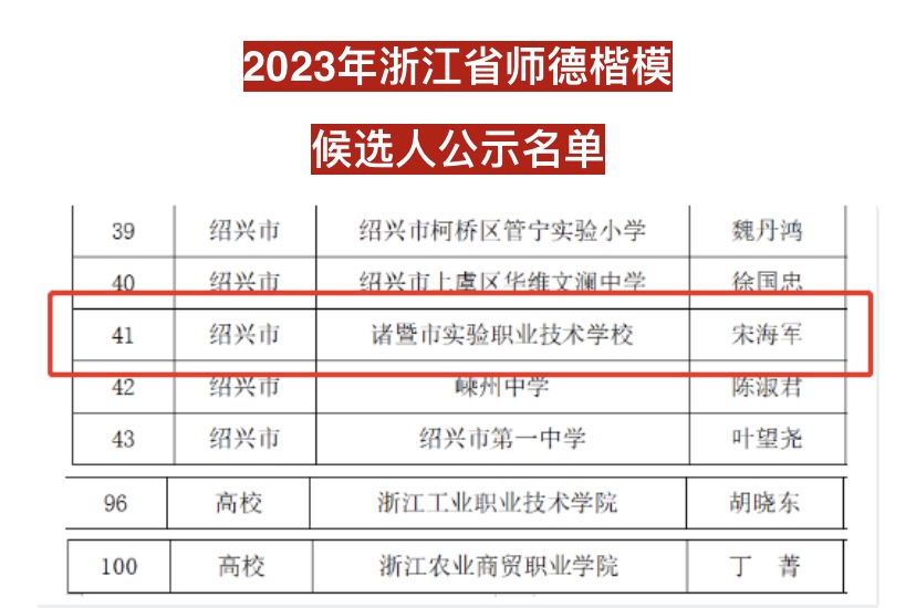 近日,浙江省教育廳公示2023年浙江省師德楷模、浙江省農(nóng)村教師突出貢獻獎候選人名單。經(jīng)基層推薦、綜合遴選,諸暨技師學院宋海軍老師入選2023年“浙江省師德楷模”候選人。