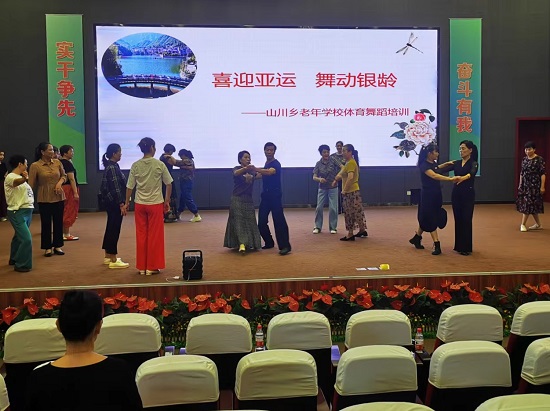 參加培訓的老年體育指導員以轄區剛退休不久的老年舞蹈愛好者為主。教學過程中,來自安吉奧星體育舞蹈培訓學校的束道金老師細心指導,學員們學習認真,專心揣摩每一個動作,并耐心地向老師請教,一天的舞蹈課在輕松愉悅的氣氛中結束。每節舞蹈課程,學員們都熱情高漲,全身心投入。參加培訓的高家堂村老年體育指導員徐雪芳阿姨表示:“我一直在村里自發組織老年人舞蹈鍛煉?,F在山川鄉老年學校組織了這樣的培訓班,既豐富了我們的知識和技能,在指導其他老年人開展舞蹈鍛煉時更有底氣了,希望今后鄉老年學??梢蚤_展更多我們老年人的培訓活動。”