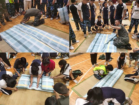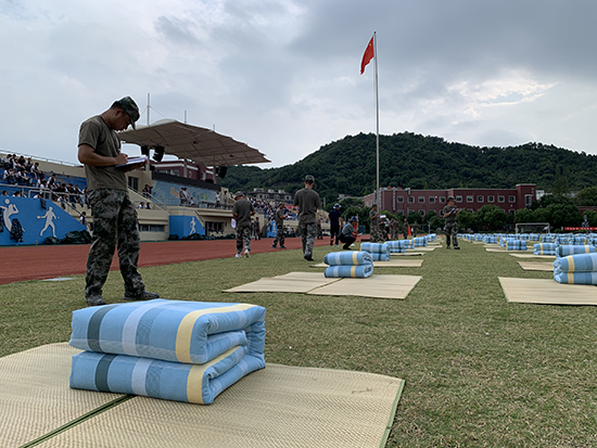 這是一場速度與智慧的較量。比賽分為兩場,團體賽中,要求每四位同學團結合作,完成一組作品。每班學員迅速分成10組,每組成員配合默契,圍在席子四周摩拳擦掌,蓄勢待發。隨著“預備,開始!”的一聲令下,選手們一捏一折,動作利落嫻熟。最后再由各班排頭的同學檢查所有作品完成情況。第二場精英賽中,各班參賽學生兩兩合作,限時10分鐘,比拼速度的同時更要保證質量。比賽結束,由教官們組成的考評組對各班疊被成果進行考評打分。
