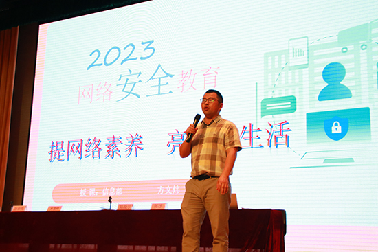 隨后,信息部主任方文煒給大家帶來了以“提網絡素養,亮數字生活”為主題的網絡安全教育講座。方老師為同學們總結了網絡視覺下中職學生的行為規范,要求同學們遵守網絡行為規范,爭做數字時代文明人,并結合目前專業部現狀及發展方向,對專業部不同學制的班級提出了各自努力方向和目標。借此機會,方老師也對全體同學進行了安全教育,要求同學們在校期間要規范自己的行為習慣,做遵規守紀的合格學生,做身心健康的陽光學生,做努力學習的優秀學生。