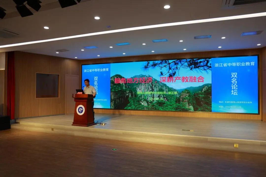 緊接著,樂清市雁蕩山旅游學校蔡正敏副校長作了題為《服務地方經濟,深耕產教融合》的發言,他結合雁旅校企合作的特色項目:節假日勤工儉學、實習數字化管理、現代學徒制探索、教師掛職鍛煉、企業文化宣講等通過圖文并茂的形式進行了闡述。