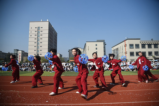 開幕式結束后,學院滾燈隊帶來了精彩表演。根據臨平地方非遺特色,學院邀請“臨平滾燈”非遺傳承人進校,體育組老師精心編排,成就了這個集健身與文化傳承于一體的特色節目。