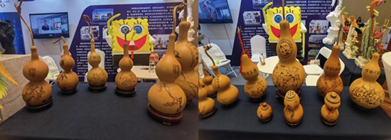 在葫蘆展示區,觀眾們被各式各樣的葫蘆工藝品所吸引。葫蘆作為一種寓意吉祥的植物,其獨特的形態和豐富的色彩為工藝美術專業師生們提供了豐富的創作素材。他們運用非遺火烙葫蘆技藝,將葫蘆這一傳統材料烙燙出精美的圖案與造型,展現了非遺火烙葫蘆工藝的獨特魅力。