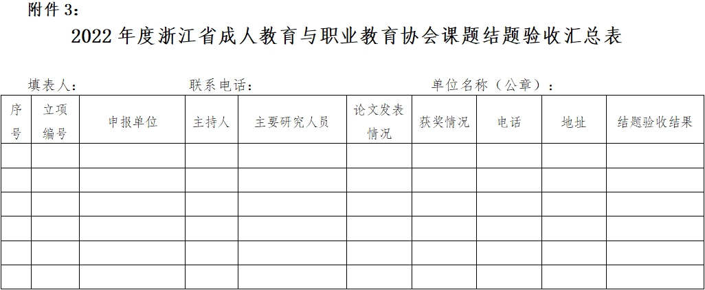 根據(jù)《浙江省成人教育與職業(yè)教育協(xié)會(huì)科研課題管理辦法》的相關(guān)規(guī)定,經(jīng)研究,決定對(duì)2022年度省成職教協(xié)會(huì)立項(xiàng)課題進(jìn)行結(jié)題驗(yàn)收,現(xiàn)將有關(guān)事項(xiàng)通知如下: