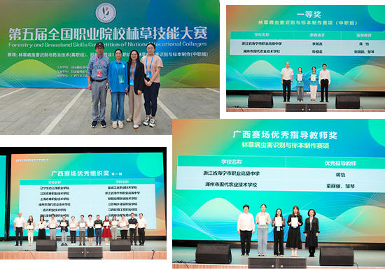 10月25至27日,第五屆全國(guó)職業(yè)院校林草技能大賽在廣西生態(tài)工程職業(yè)技術(shù)學(xué)院舉行。在中職“林草病蟲害識(shí)別與標(biāo)本制作”比賽項(xiàng)目中,經(jīng)過(guò)圖片鑒定病蟲害種類、鏡檢鑒定病蟲害種類、病原永久玻片、干標(biāo)本鑒定病蟲害種類、標(biāo)本制作競(jìng)賽等多環(huán)節(jié)的激烈角逐,湖州市現(xiàn)代農(nóng)業(yè)技術(shù)學(xué)校園藝技術(shù)2201班陳栩諾同學(xué)以總名次第2的成績(jī)喜獲一等獎(jiǎng),童麗麗、鄒琴獲優(yōu)秀指導(dǎo)教師獎(jiǎng),學(xué)校獲優(yōu)秀組織獎(jiǎng),全國(guó)共有24個(gè)省市的代表隊(duì)參加該項(xiàng)目比賽。