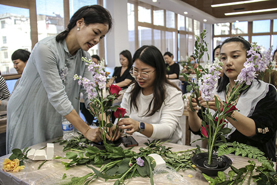 培訓中,紹興市風景園林學會插花分會會長、紹興財經旅游學校副校長、插花專任教師夏美娟為居民們提供了全面的講解和指導。課程從基礎知識開始,介紹了插花藝術的歷史、流派和基本原則。居民們通過實踐操作,親自動手制作了各種花藝作品,學習了不同的插花技巧和樣式。