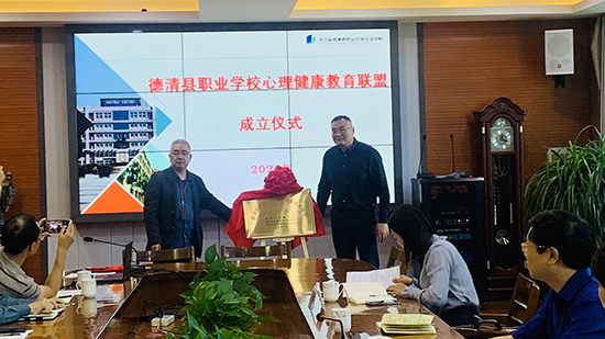 會上,潘云祥和德清職業中專副校長呂夢非共同為德清縣職業學校心理健康教育聯盟成立揭牌。羅書洋為該聯盟負責人崔明敏老師頒發聘書。崔明敏老師作表態發言。