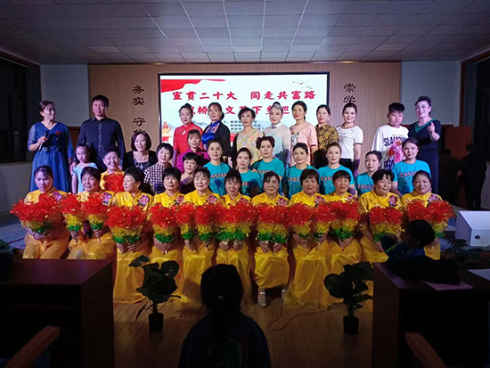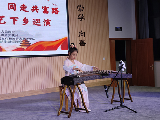 首先出場的來自新擇湖村王挺小朋友表演的架子鼓《Frantic》《不在猶豫》,小小年紀,架子鼓打得相當嫻熟,現場氣勢相當強,真如“嘈嘈切切錯雜彈,大珠小珠落玉盤”,聽得在場的觀眾心胸澎湃,激情萬分。舞蹈、歌曲等節目依序上場表演,一個個節目不輸電視中轉播的晚會節目,觀眾們只能拿著手機不停地拍攝。當丁浠然小朋友身著典雅古裝上臺,文靜地來到古箏前,熟練地彈起《我和我的祖國》,讓人耳目一新,傳統的樂器、現代的曲目、熟悉的旋律,大家隨著樂聲哼唱起來,臺上臺下同聲一氣。“一幅畫圖識釵裙,春心動蕩小帝君”的唱詞傳來,悠揚的樂曲聲響起,原來是越劇《孟麗君·游上林》選段,由新擇湖村的陳孝琴和王群英表演演唱,兩人素面朝天,動人的唱腔還是打動了觀眾,沉浸在曲詞中,回顧《孟麗君》中的劇情,回味那婉轉動人的唱詞。幸福的時刻總是短暫的,熟悉的旋律響起,演員們紛紛來到臺上,共唱《難忘今宵》,晚會在觀眾們留戀中落下帷幕。