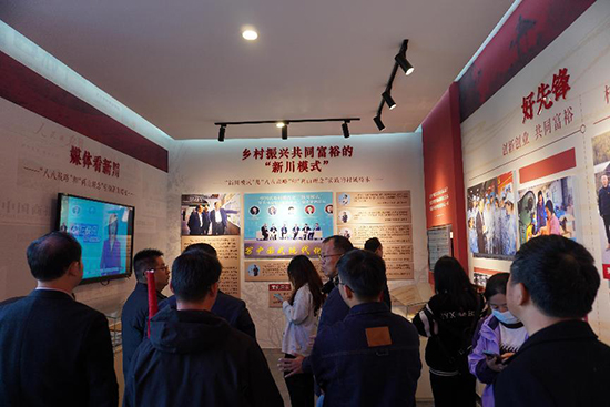 師生一行在新川村黨委委員張小強的引導下,先后參觀了鄉(xiāng)村振興案例館、誠信館、初心館、居家養(yǎng)老服務(wù)中心等,借助照片、數(shù)據(jù)、實物和音視頻等多種宣傳媒介手段,近距離感受到了新川村與天能“村企共建”的山鄉(xiāng)巨變。老照片里的新川村曾經(jīng)高污染企業(yè)遍地開花,眼前的新川成為青山綠水富一方百姓的“世外桃源”。新川的美麗蛻變得益于村里果斷關(guān)停污染礦山,堅決淘汰落后產(chǎn)能,堅持走人與自然和諧共生的綠色發(fā)展之路,不斷提升綠水青山“顏值”,開掘金山銀山“價值”。這還得益于天能集團帶頭忠實踐行“綠水青山就是金山銀山”理念,通過“村企共建”,不僅讓新川村的綠水青山回來了,還讓村民的腰包“鼓起來”了。昔日的“苦瓜村”變成如今家家有別墅,戶戶有轎車的“富美村”。