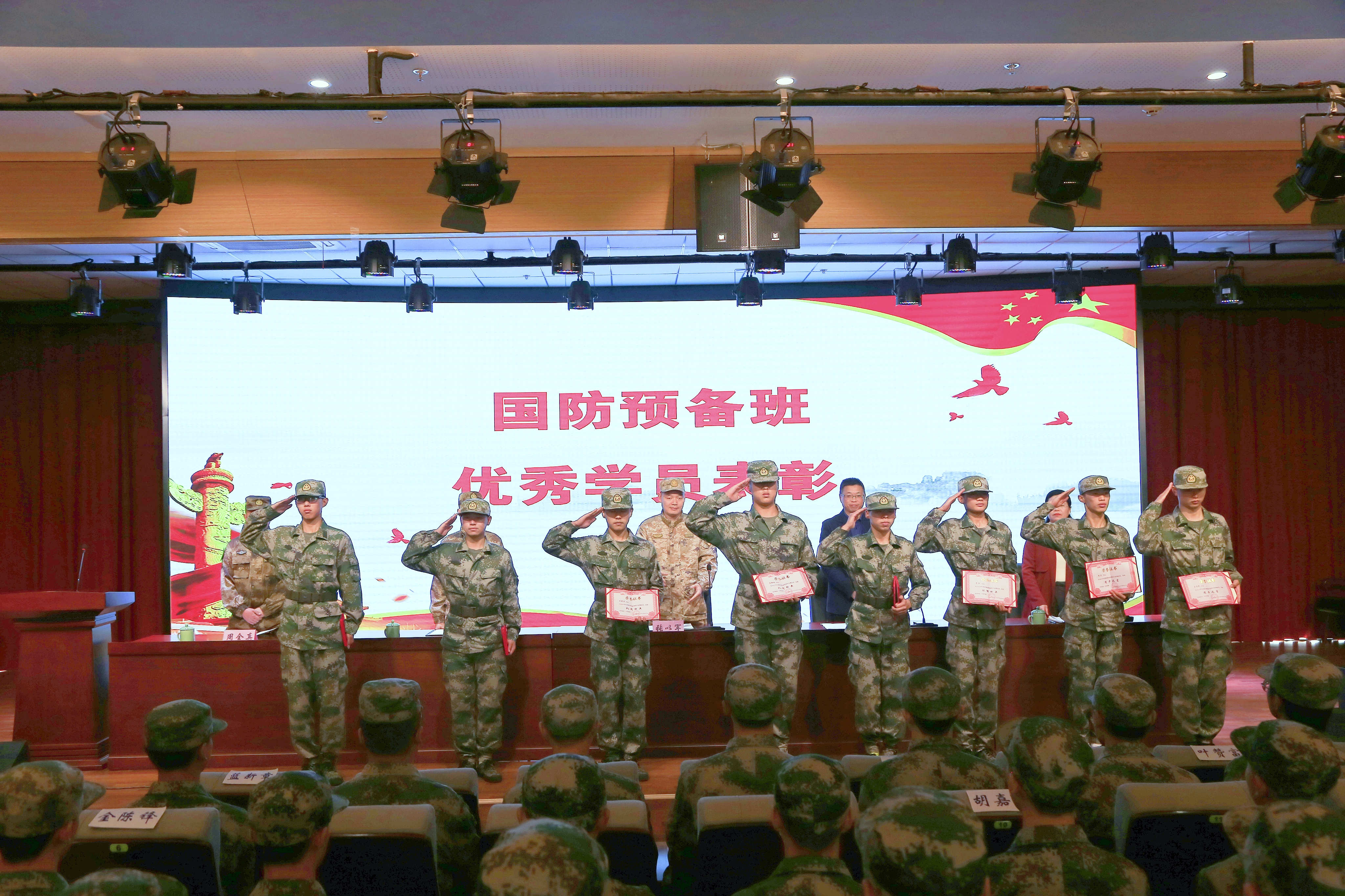 林偉琴宣讀國防預備班2022學年優秀學員名單。張以軍、陳偉華分別為優秀學員頒發證書。