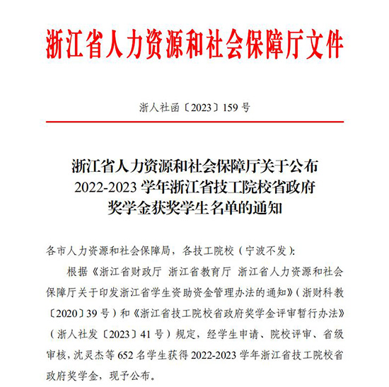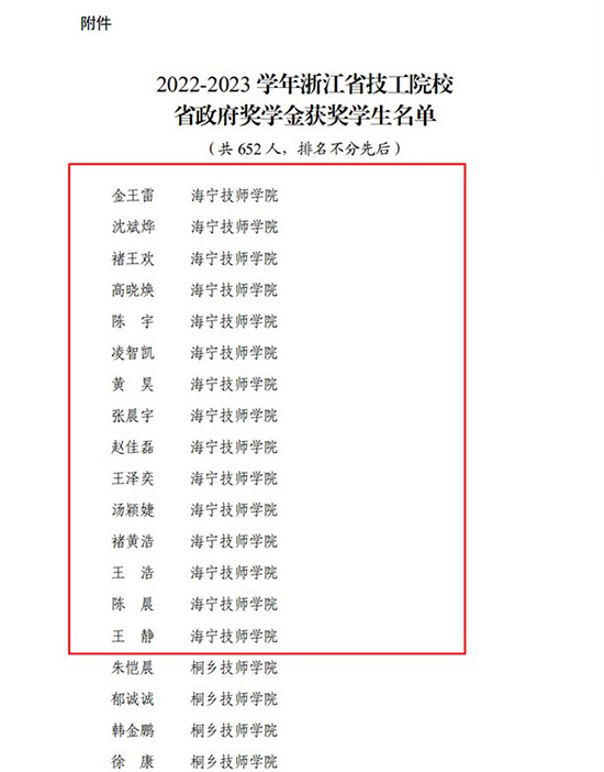 11月24日,浙江省人力資源和社會保障廳印發(fā)關(guān)于公布2022—2023學(xué)年浙江省技工院校省政府獎學(xué)金獲獎學(xué)生名單的通知,全省共有652名學(xué)生獲此殊榮,海寧技師學(xué)院共有15名學(xué)生上榜,每人獎勵6000元!