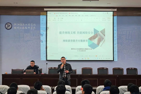 為提升學生網絡素養,防范電信詐騙和校園欺凌事件的發生,并向學生普及網絡安全知識和相關法律,強化學生自我保護和防范能力,增強網絡安全意識和法治意識,營造安全、健康、文明的網絡環境,12月7日,浙江信息工程學校·湖州工程技師學院“網絡行為視角下中職生行為規范提升路徑研究課題組”聘請學校法治副校長、仁皇山派出所副所長徐駿為課題組專家宣講員。徐警官也為信息部高一年級200余名學生帶來了一堂題為“謹防網絡詐騙 提升網絡素養 共筑安全防線”的法治教育主題講座。徐所長講座主要從預防網絡詐騙和遠離網絡暴力兩方面展開。
