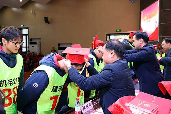 學(xué)校領(lǐng)導(dǎo)為班級(jí)代表佩戴成人禮帽、成人徽章,贈(zèng)予《中華人民共和國(guó)憲法》讀本,勉勵(lì)同學(xué)們認(rèn)真學(xué)習(xí)憲法知識(shí),提升法治素養(yǎng)、增強(qiáng)公民責(zé)任感,在實(shí)際行動(dòng)中踐行憲法精神。