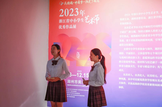 在本次省中小學(xué)生藝術(shù)節(jié)優(yōu)秀作品展活動(dòng)現(xiàn)場(chǎng),藝校優(yōu)秀學(xué)子代表——第八屆全國(guó)學(xué)生“學(xué)憲法 講憲法”演講比賽高中組亞軍獲得者葛圣依和2023年浙江省“誦讀中國(guó)”經(jīng)典誦讀大賽中學(xué)生組一等獎(jiǎng)獲得者王十一,作為出彩新生力量亮相美術(shù)館,懷揣志愿服務(wù)精神,以極具專業(yè)性與親和力的表達(dá),為獲獎(jiǎng)作品做現(xiàn)場(chǎng)講解,讓慕名而來的觀眾能夠更好地了解每一件作品的設(shè)計(jì)理念與制作工藝,為進(jìn)一步傳播深化藝術(shù)節(jié)活動(dòng)主題和意義添彩賦能。