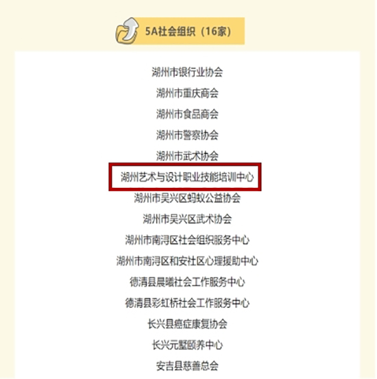 根據(jù)《湖州市民政局關(guān)于做好社會組織評估工作的通知》(湖民社通〔2023〕3號),通過社會組織自評、業(yè)務(wù)主管單位初審、第三方評估機(jī)構(gòu)實(shí)地考察評估,經(jīng)審核、公示,確定湖州藝術(shù)與設(shè)計(jì)職業(yè)技能培訓(xùn)中心再次評定為湖州市5A社會組織。