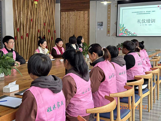 為加強民宿服務管理,樹立“客人至上、服務第一”的意識,強化服務員主觀意向和心理狀態,提高客戶體驗感,日前,安吉縣孝豐成校聯合白楊村村委及安吉縣姐妹家政服務公司,在白楊村村委組織開展了民宿服務禮儀、環境保潔主題培訓,來自白楊村的28位民宿服務人員參加培訓。