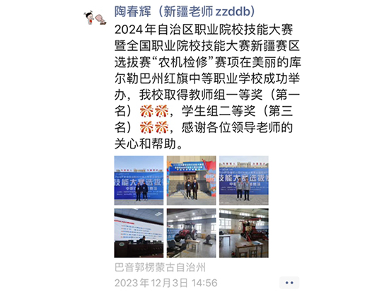“沈老師,我們學(xué)校拿到了全國(guó)職業(yè)院校技能大賽新疆賽區(qū)選拔賽“農(nóng)機(jī)檢修”賽項(xiàng)教師組一等獎(jiǎng),學(xué)生組二等獎(jiǎng)!”12月2日,海寧市職業(yè)高級(jí)中學(xué)沈老師收到千里之外的新疆發(fā)來(lái)的好消息。作為農(nóng)機(jī)檢修賽項(xiàng)的海寧職高國(guó)家級(jí)金牌教練、海寧市名師沈松良,深耕農(nóng)機(jī)檢修賽項(xiàng),結(jié)對(duì)阿克蘇地區(qū)老師,名師引領(lǐng)促進(jìn)成長(zhǎng),通過(guò)線上線下相結(jié)合的方式,幫助他們?cè)诩寄鼙荣愔腥〉靡坏泉?jiǎng)的好成績(jī)。