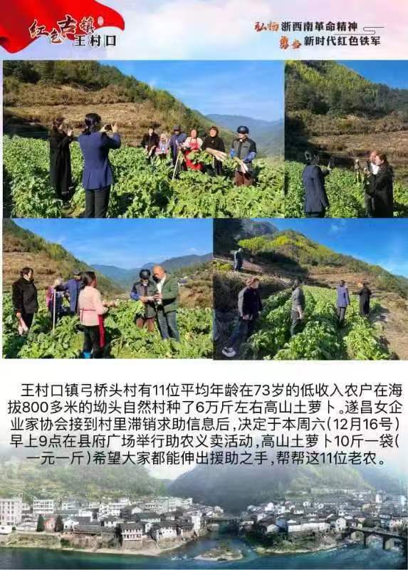 據(jù)了解,此次活動(dòng)是遂昌縣女企業(yè)家協(xié)會(huì)在11月成立后首次發(fā)起的愛(ài)心助農(nóng)活動(dòng)。源于遂昌王村口鎮(zhèn)弓橋頭村是一個(gè)只有45個(gè)常駐人口的小村,村里有11位平均年齡在73歲的低收入農(nóng)戶,在收到該村老農(nóng)種的高山土蘿卜滯銷(xiāo)難題的求助信息后,女企業(yè)家協(xié)會(huì)就前往實(shí)地了解,發(fā)揮資源多、渠道廣的優(yōu)勢(shì)擴(kuò)散求助信息,通過(guò)“線上+線下舉辦一場(chǎng)義賣(mài)活動(dòng)”相結(jié)合的方式為困難農(nóng)戶代售土蘿卜。