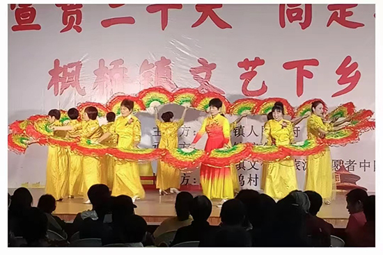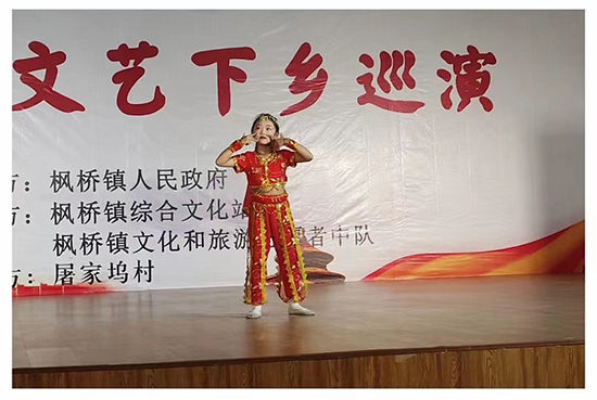 楓橋鎮(zhèn)楓之韻藝術(shù)團(tuán)的開場(chǎng)舞《盛世歡歌》通過艷麗的服裝、統(tǒng)一的動(dòng)作、灑脫的舞姿,吸引了臺(tái)下觀眾的目光。接著,隨著異域風(fēng)情的音樂響起,一個(gè)身穿色彩鮮艷舞服的小女孩合著音樂節(jié)拍跳起印度舞《歡樂的婆羅多》,她叫屠果姸,今年8歲,奔放的動(dòng)作、妸娜的身姿、動(dòng)人的笑容征服了觀眾的心,大家不由贊嘆“跳得真好!”當(dāng)《佳木斯快樂舞步》的演員上臺(tái)后,現(xiàn)場(chǎng)響起熱烈的掌聲,屠家塢村舞蹈隊(duì)的隊(duì)員們身著紅白相間的運(yùn)動(dòng)裝,手戴白色手套,12個(gè)人隨著音樂的節(jié)奏舞動(dòng),動(dòng)作熟練、姿態(tài)自然,陶醉在舞蹈帶來(lái)的快樂中。到季麗君、屠朝琴的越劇唱段《孔雀東南飛選段》《洞房》時(shí),現(xiàn)場(chǎng)氣氛熱烈,精準(zhǔn)的唱腔、清晰的吐詞、嫻熟的動(dòng)作,盡管素妝上臺(tái),同樣獲得了觀眾的好評(píng)。觀眾們沉浸在一個(gè)個(gè)精彩的節(jié)目中,現(xiàn)場(chǎng)掌聲不斷。