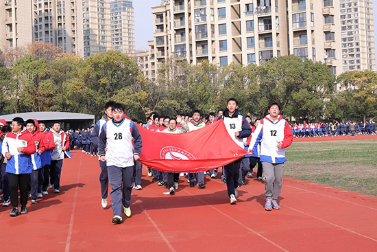 頂著寒風(fēng),四名校田徑隊員守護著校旗,步調(diào)一致地跑在跑道中央,全校79個班級組成的79個方陣由班主任帶隊一起慢跑前進,體育分管校長則領(lǐng)跑在前。因為班級數(shù)量較多,全校各班分成田徑場、籃球場、行政樓大花壇周邊三個區(qū)域同時展開跑步,跑步的距離是1200米。幾圈跑下來,同學(xué)們感到渾身暖和,倍感舒適,個別同學(xué)雖然氣喘吁吁、累得幾度想放棄,但還是在老師的鼓勵下堅持跑完全程。