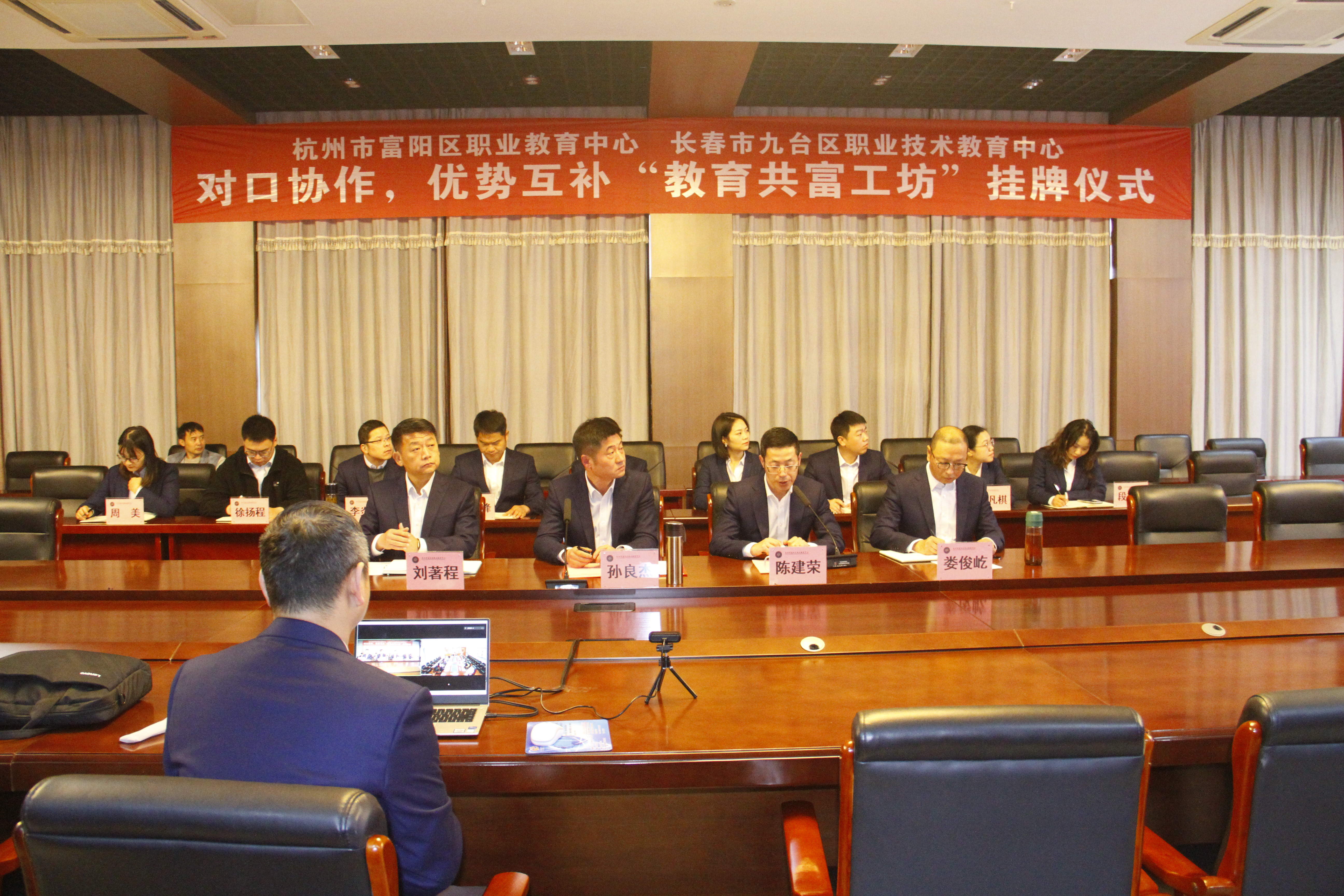 為貫徹黨中央、國務院關于實施新一輪東北振興戰略的決策部署,落實省市深化對口合作框架協議,持續推動對口合作工作高質量發展,深化富陽區和九臺區的職業教育在專業教學資源建設,師資隊伍能力提升,創新創業合作、科研服務能力等領域合作,促進職業教育融合發展,2023年11月30日,杭州市富陽區職業教育中心與長春市九臺區職業技術教育中心開展“對口協作,優勢互補”為主題的線上“教育共富工坊”掛牌儀式。會議由學校副校長陳建榮主持。杭州市富陽區職業教育中心校長孫良杰,長春市九臺區職業技術教育中心校長楊紹山,以及兩校分管校長、科室負責人及相關教研組長等出席會議。