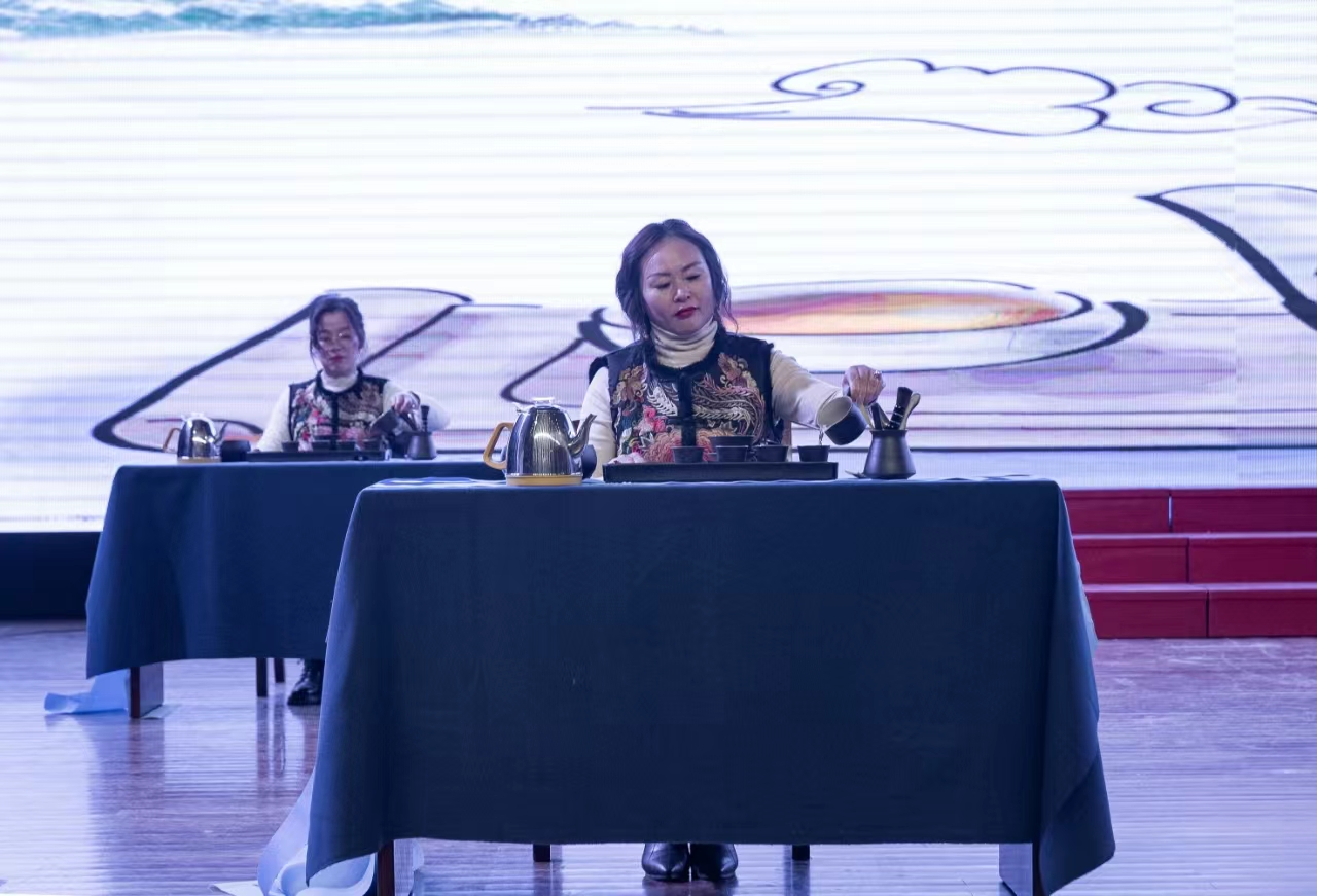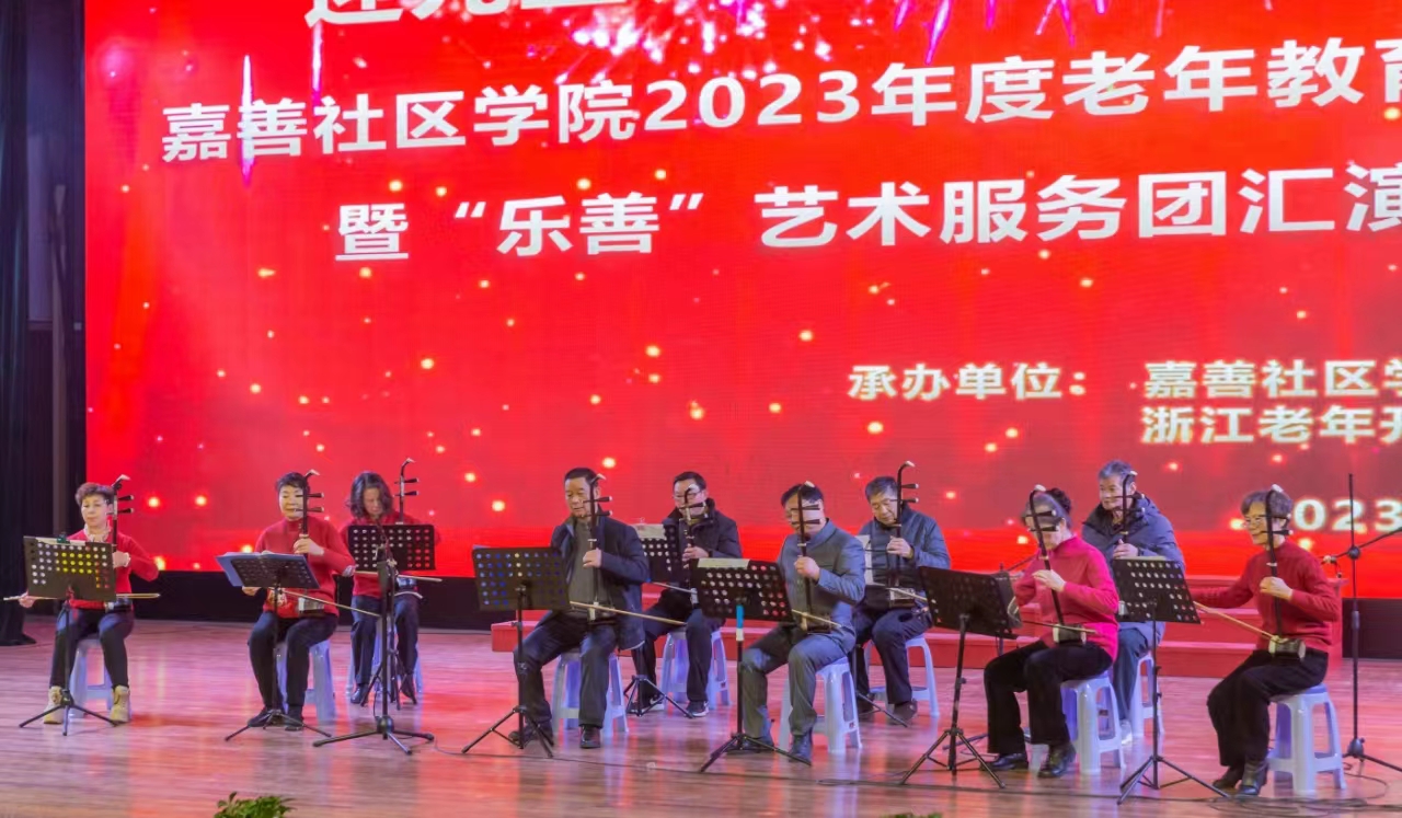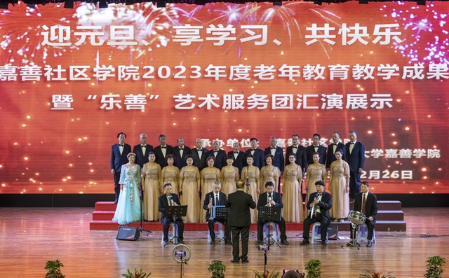 12月26日下午,在喜氣洋洋的民樂合奏《金蛇狂舞》中,嘉善社區學院2023年度老年教育教學成果暨“樂善”藝術服務團匯演展示在高級中學文體禮堂正式拉開帷幕。