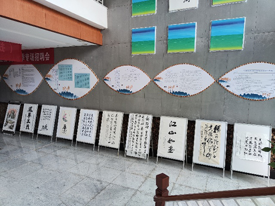 天子湖分院的大廳、廊道兩側整齊地擺放著學員們典雅精致、獨具匠心的書畫作品,吸引眾多來辦理事務人員駐足欣賞。