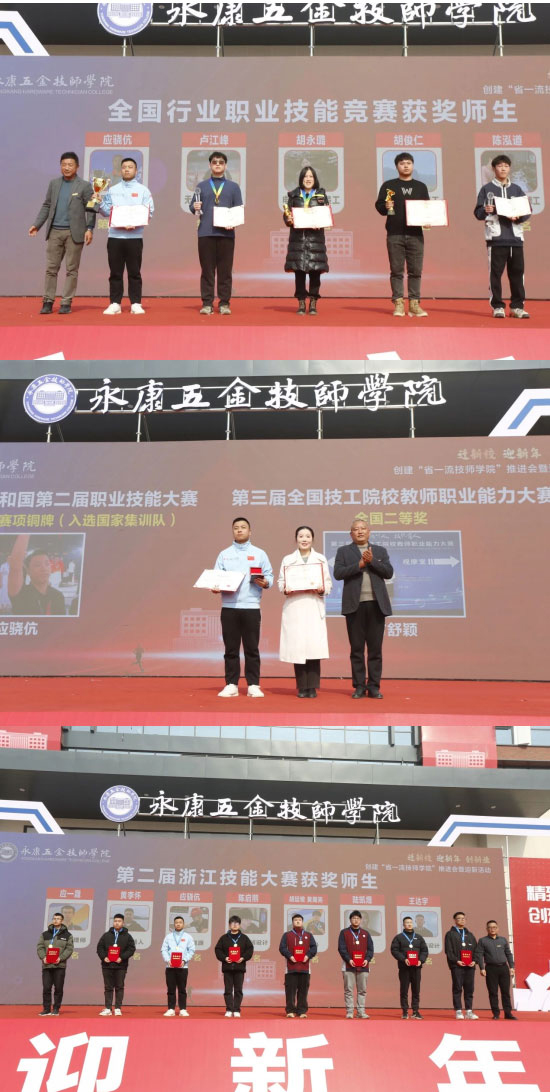 近年來,學(xué)校堅持大賽引領(lǐng),積極錨定對接世界技能大賽、國家職業(yè)技能大賽、教師職業(yè)能力大賽等賽事,精心組織各級各類技能大賽的參賽、承賽工作,營造崇尚技能氛圍,實現(xiàn)以賽促學(xué)、以賽促練、以賽促教。大會對2023全國技能大賽獲獎師生進行了表彰,校黨委委員田雪萌、胡贊、馬林剛等領(lǐng)導(dǎo)分別為行業(yè)國賽獲獎選手、省政府獎學(xué)金獲得者、浙江省第二屆技能大賽獲獎?wù)摺⑷脒x國家隊選手、教學(xué)能力大賽國賽二等獎選手頒獎。曹法余書記、永康市人力社保局黨組成員盧慧紅為第47屆世界技能大賽中國集訓(xùn)基地揭牌。