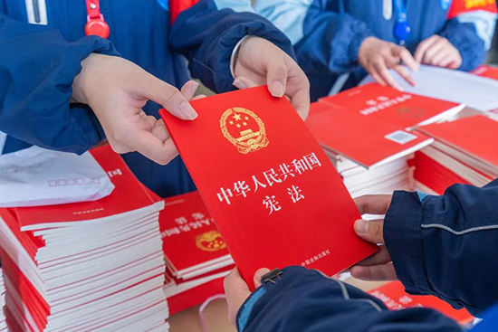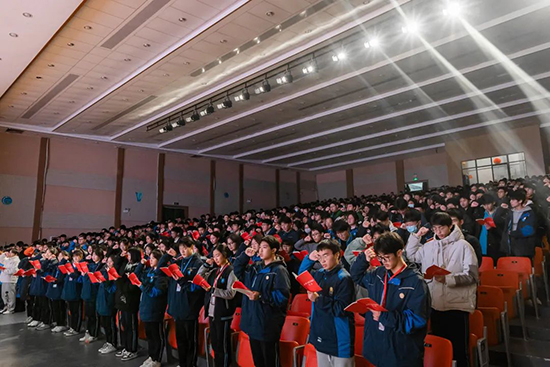 在場的老師們為學生代表們發放《中華人民共和國憲法》并佩戴上了紀念徽章。全場同學握舉右拳,在工程造價21班盧宇希同學的帶領下,許下了堅定的成年誓言。