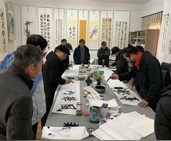 書畫社部分成員在社長魏仁虎的帶領下走進教室,紛紛鋪開宣紙,凝神定氣、在不同規格的宣紙上龍飛鳳舞,不一會兒,在對開、橫開、條幅、橫批、立軸上出現了一條條、一幅幅、一對對吉祥如意、國富民泰的詞句,斗方中則出現了不同字體的“福”字和四字祝福語。魏仁虎在條幅上寫下了“盡得其樂”四個蒼遒有力的大字。社員們寫好后,互相品評鑒賞,從書寫、字形、筆勢、布局指出好處與不足,坦誠相待,其樂融融。隨后,在魏仁虎的提議下,在場社員在長卷中合作創作書畫合璧的作品,擅長繪畫的駱江山畫下恢弘氣勢的山水畫;有的橫寫四字大字;有的豎寫小楷詩句。每人字體、字形、大小不一,筆走龍飛,布局合理。