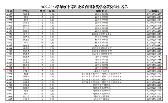 2023年12月末,教育部、人力資源和社會保障部發布了《2022—2023學年度中等職業教育國家獎學金獲獎學生名單》的公告,海寧技師學院5名學生獲得中職國家獎學金,截止目前海寧技師學院已共有25名學子獲得本項國家級殊榮。