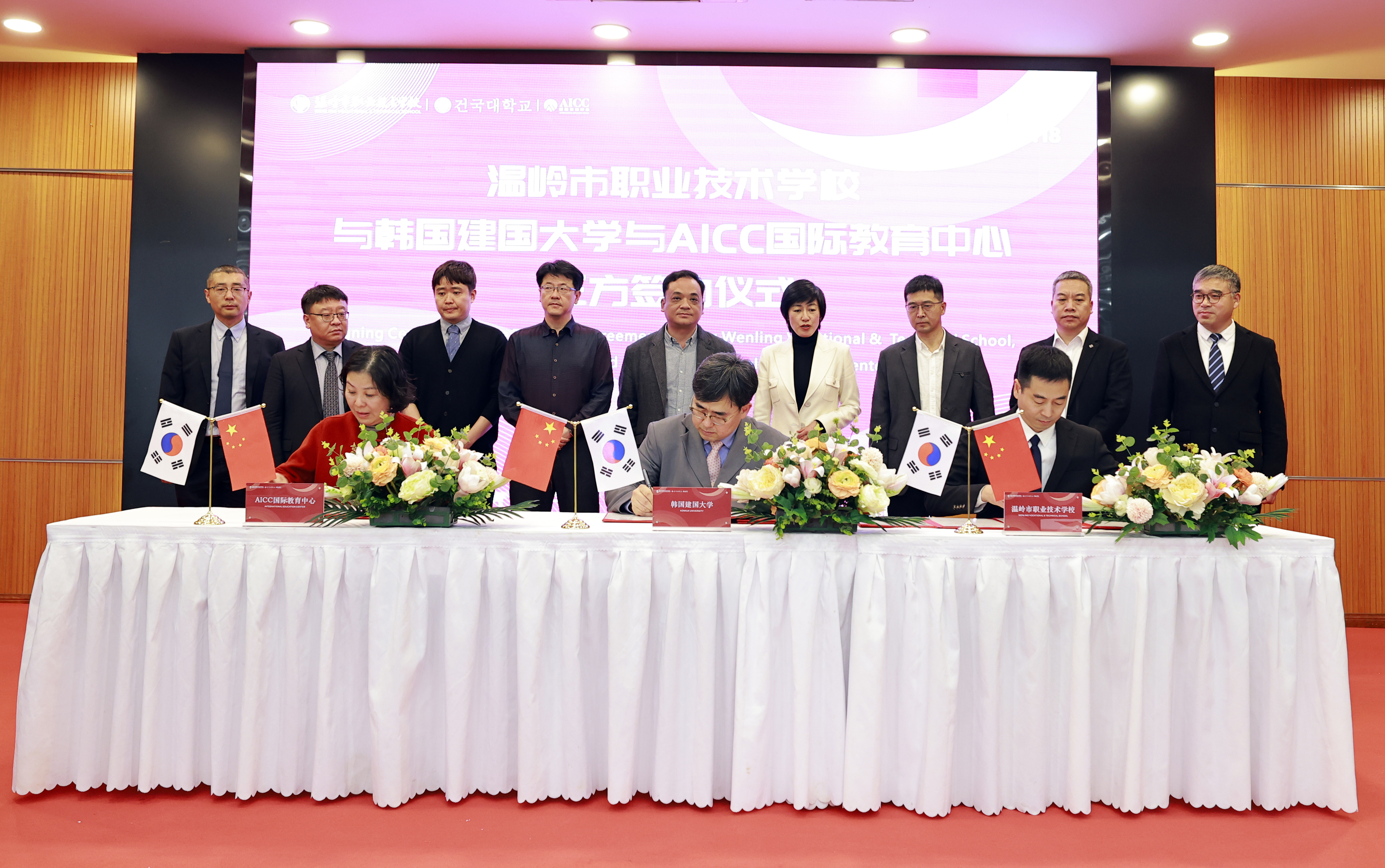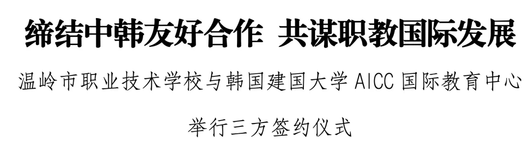 隨后,溫嶺市職業(yè)技術(shù)學(xué)校與韓國(guó)建國(guó)大學(xué)、AICC國(guó)際教育中心舉行三方簽約儀式。