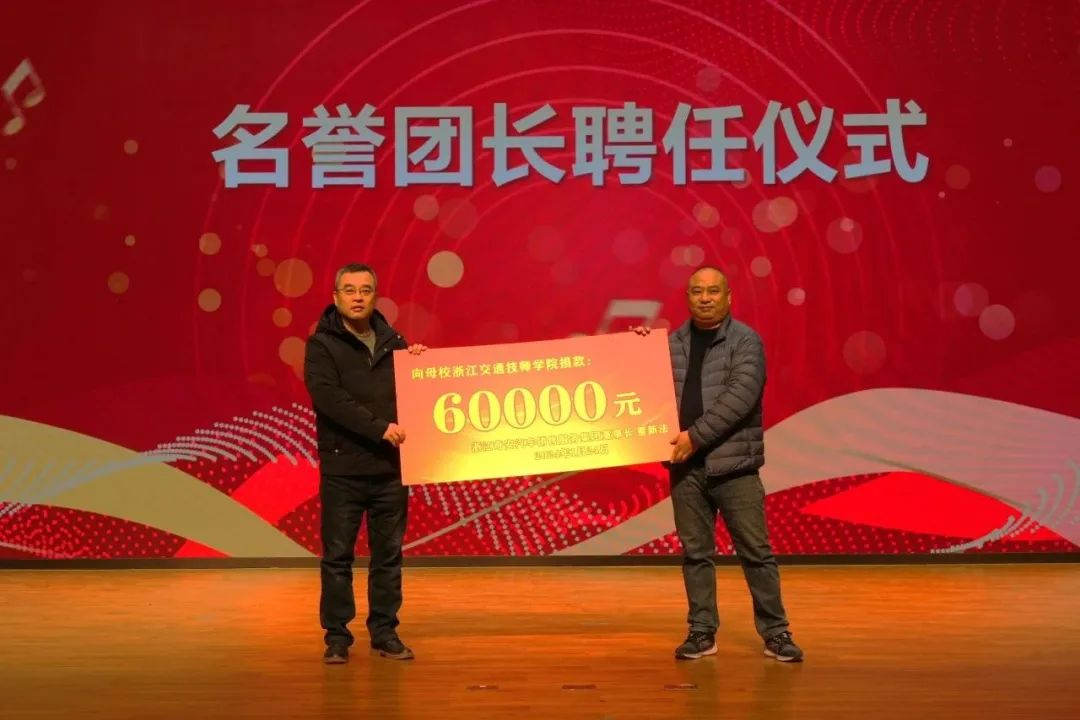 藝術團聘任優秀校友永康奇安汽車銷售服務集團董事長董新法擔任名譽團長。董新法為學校95屆裝配17班畢業生,畢業后深耕汽車維修、銷售行業20多年,現擁有6家汽車4S店,企業涉及傳媒、供應鏈等領域,今天代表董新法出席儀式是同為我校畢業生的集團副總裁樓旭軍。