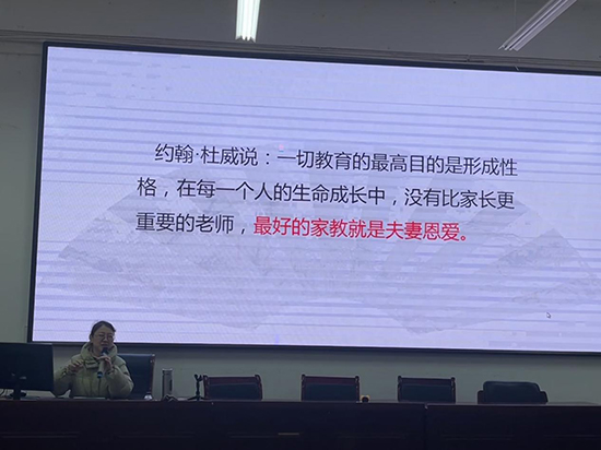 政教處副主任蔡章紅首先強調了夫妻恩愛對家庭教育的積極影響,圍繞幸福婚姻需要的兩種能力:發展出能夠處理沖突的能力和發展友情的能力展開,通過心理工作經驗幫助教師們認識到夫妻關系對于孩子成長過程中的至關重要性,從而增強教師關注和參與學生家庭教育的能力。