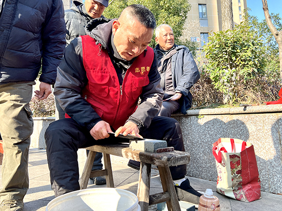 “春滿人間民泰安 龍騰云海國昌盛”來自太湖街道成校的書法老師揮毫潑墨,一幅幅墨香濃郁、寓意美好祝福的大紅春聯(lián)和喜慶“福”字及“龍”形字畫躍然紙上,讓前來領(lǐng)取春聯(lián)的居民喜笑顏開。“手寫春聯(lián)、福字是在用墨香傳遞傳統(tǒng)文化,這份‘新年禮物’何等珍貴,相比購買印刷的春聯(lián)、福字,手寫得更有人情味。”王阿姨手捧新鮮出爐的春聯(lián)開心地說。志愿服務(wù)廣場一側(cè)是城管、消防、公安、銀行在開展垃圾分類、文明養(yǎng)犬、燃氣安全、禁止燃放煙花爆竹、反詐等宣傳,他們向前來的居民們發(fā)放單頁,進行現(xiàn)場普及、講解;另一側(cè)則是愛心商戶們支起的市集攤位,骨科義診、口腔義診、量血壓、測血糖等形式進行衛(wèi)生健康科普宣傳,倡導廣大居民主動學習健康知識,掌握健康技能,踐行文明健康的生活方式,積極營造“全民健康、人人參與”的良好社會氛圍;與此同時還有義剪、磨剪刀等便民服務(wù),吸引了一眾居民前來參與,場面熱火朝天。