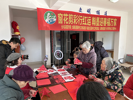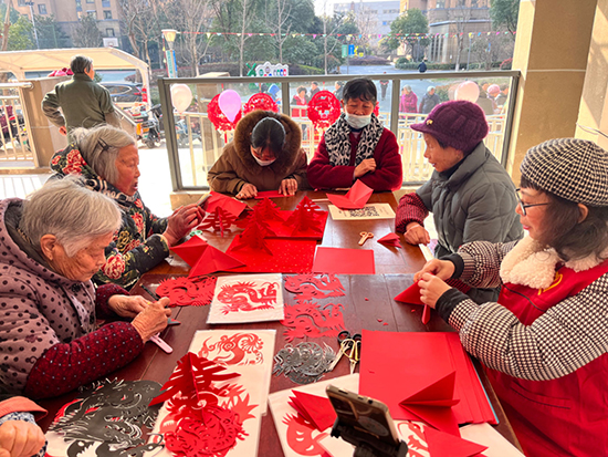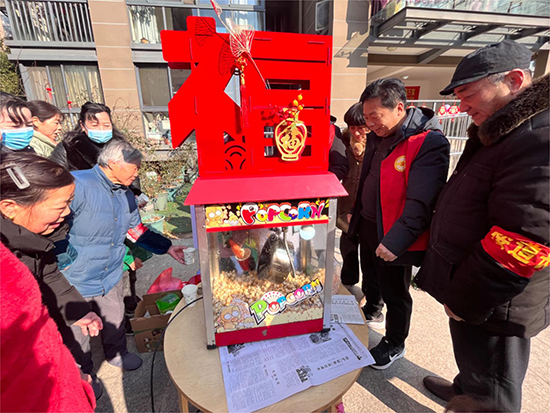 不遠處的樓道里傳出宛轉(zhuǎn)悠揚的戲曲聲,一曲經(jīng)典越劇在文明樓道睦鄰廳內(nèi)拉開帷幕,這是熱愛戲曲的居民們自發(fā)組建的一支表演團隊,他們中年紀最大的已達到75歲,因為藝術(shù)讓他們相遇,因為熱愛讓他們聚集在此。現(xiàn)場來了不少觀看表演的居民,時不時發(fā)出熱烈的叫好聲;隔壁的共享廳也不閑著,來自太湖街道成校的王老師正在剪窗花指導,現(xiàn)場還開起了抖音直播,大家認真學著各種剪紙技巧,盡情地發(fā)揮自己的創(chuàng)意,切身感受中華民族傳統(tǒng)民間藝術(shù)的魅力,春、福、喜、龍……大家剪出各式各樣的美妙圖案,借一剪一紙,裁出紙上年味,傳達樸素愿望,喜迎龍年新歲月。黨員志愿者和樓道長們則是在一旁為前來的孩子們制作爆米花,一粒粒香甜可口的爆米花帶來的不止美味,更是孩子們對新春的期盼!