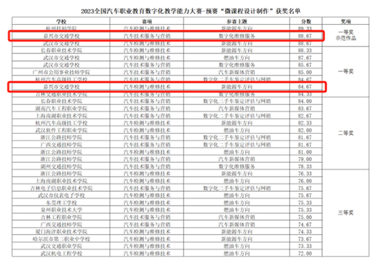 近日,從2023全國汽車職業(yè)教育數(shù)字化教學能力大賽—預賽“微課程設計制作”能力比賽成績公布中獲悉,嘉興市交通學校(嘉興交通技工學校)唐麗燕、楊佳艷團隊和王峰、呂宇倫團隊提交的兩個作品分別獲得本次“微課程設計與制作”汽車技術服務與營銷、汽車檢測與維修技術兩個賽項預賽的一等獎。其中唐麗燕和楊佳艷團隊的作品獲得該賽項的第二名,并在全國各大職業(yè)院校進行示范推廣。