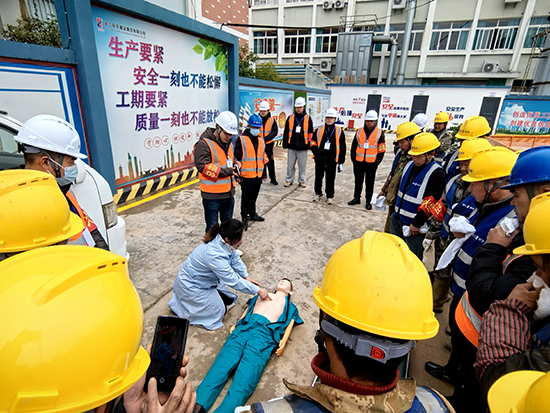 會上,全體人員觀看安全警示片,進行現場消防、醫護演練。項目經理、監理單位進行項目介紹和安全提示并作表態發言。隨后,縣住建局局長項文偉、縣教育局副局長吳林輝、縣職技校副校長吳根榮分別就安全生產進行點評。