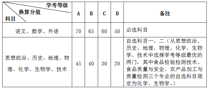 2.普高招生考生高中學考等級要求:①無E等級;②語文、數學、外語為必選科目;③自選科目兩門,從思想政治、歷史、地理、物理、化學、生物學、技術中選擇學考等級最優的兩門,其中食品檢驗檢測技術、食品質量與安全、農產品加工與質量檢測三個專業的自選科目限定為化學、生物學;④高中學考等級以浙江省教育考試院提供的成績為準。