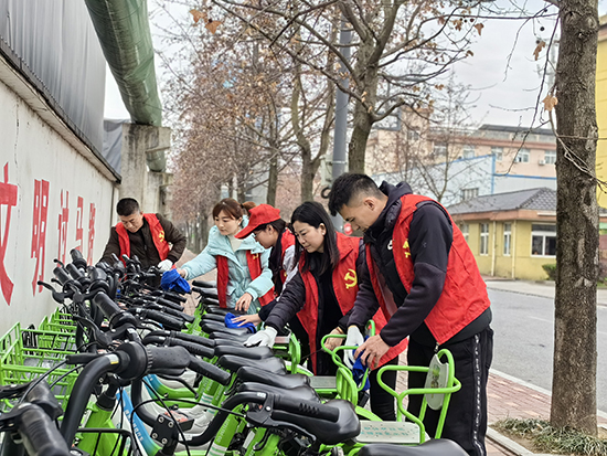 黨員教師身著志愿者服裝,帶上掃帚、抹布等工具,分組分片走向街頭,開展美化公共環境整治行動。大家分工合作,清掃街道、拾取垃圾、清理廢舊廣告...在美化環境的同時,黨員教師們還積極維護公共設施,將擺放混亂、帶有污漬的公共自行車、電瓶車重新擺放整齊、擦洗干凈,對銹損的鏈條、松動的螺絲、失靈的剎車進行維護,為文明城市建設貢獻自己的力量。