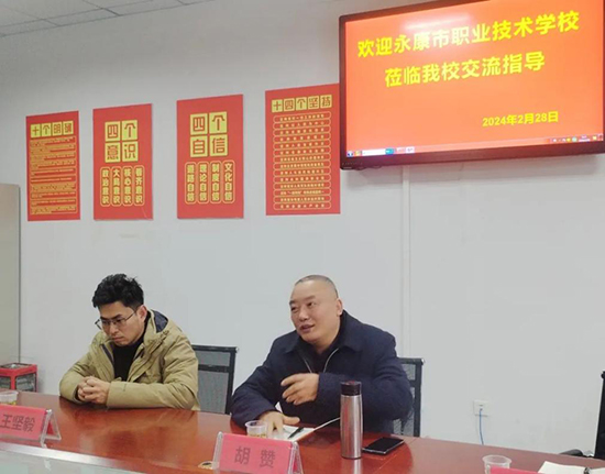 在納雍,胡贊詳細介紹了“東遷西歸”項目在永康的進展。會上,他與該校領導班子、相關專業負責人共商職教合作事項,雙方分別就線上教學開展方式、課程設置、課程選擇等問題展開深入交流。