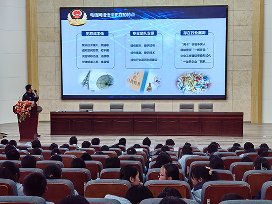 “反詐篇——向網(wǎng)絡(luò)電信詐騙說‘不’”。大屏幕中展示出一幅幅緬甸電信詐騙犯被抓回國的圖片,明確什么叫電信網(wǎng)絡(luò)詐騙。趙信詳細講解電信詐騙的途徑、方式、特點與危害。當(dāng)講到“犯罪成本低”“專業(yè)團隊支撐”“存在行業(yè)漏洞”的特點時,例舉了“今年1-5月份,諸暨市前十類高發(fā)的詐騙類型總數(shù)共5182起,占電信網(wǎng)絡(luò)詐騙發(fā)案總數(shù)6066起的85%。其中18歲以下428人,占7%。”趙信歸結(jié)電信詐騙高發(fā)的原因為“沒錢了要借錢、錢不多要省錢、掙錢了要生錢和有錢了要幸福”。之后,又介紹了“殺豬盤”、博彩類、貸款、注銷貸款等八種詐騙類型,提醒學(xué)生一定要保護自己的個人信息安全,時刻做到“三不一要”。即:不要隨意透露個人信息、不要隨意掃描二維碼、不要連接公共場所的WiFi;要安裝國家反詐APP,并隨時提醒身邊的親友。