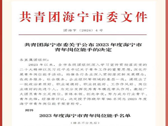 2023年以來,海寧市各級團(tuán)組織深入學(xué)習(xí)宣傳貫徹落實(shí)黨的二十大精神以及習(xí)近平總書記關(guān)于青年工作的重要思想,深入開展青年崗位能手評選活動,涌現(xiàn)出了一批政治素質(zhì)高、職業(yè)道德好、職業(yè)技能精、工作作風(fēng)好、崗位業(yè)績優(yōu)的先進(jìn)個(gè)人。海寧市職業(yè)高級中學(xué)王靜老師也名列其中,喜獲海寧市青年崗位能手稱號。