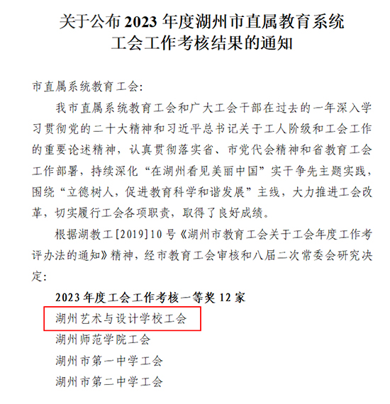 近日,湖州市教育工會(huì)八屆二次委員(擴(kuò)大)會(huì)議順利召開,會(huì)上表彰了湖州市直屬基層教育工會(huì)工作考核一等獎(jiǎng)的12家工會(huì),浙江省湖州藝術(shù)與設(shè)計(jì)學(xué)校工會(huì)在眾多考核單位中位列第一。