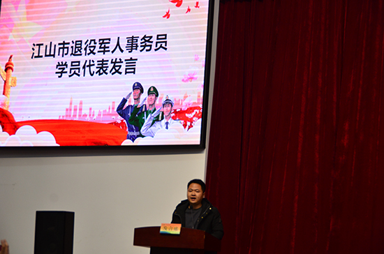 學員代表周建青發言,他號召全體學員“力排雜念,潛心研學;端正學風,效率為先;學以致用,無私奉獻”,表示決不辜負黨和國家的親切關懷和殷殷厚望,在新征程上書寫新時代退役軍人服務工作的新篇章。