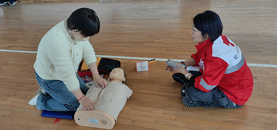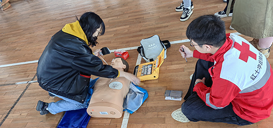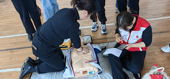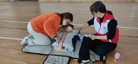 在實操環節,紅十字會工作人員向培訓班學員發放了急救包、應急救護知識手冊以及一次性呼吸膜、三角巾、繃帶等急救練習工具,王醫生對心肺復蘇、創傷救護和骨折固定、搬運等急救知識進行了“手把手”的現場實操練習。