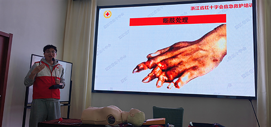 “當身邊意外發生時,掌握必備的急救技能,關鍵時刻能救人一命……”紅十字會講師王寶峰利用PPT,通過淺顯易懂的語言和現場示范、互動的方式,為學員講解紅十字運動知識、救護概念、創傷救護、氣道異物梗阻、心肺復蘇和AED、突發事件和常見意外傷害等方面的知識。