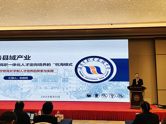 海寧市職業(yè)高級中學(xué)黨委書記、校長朱曉明作為浙江省職業(yè)院校唯一代表在會上作了題為《服務(wù)縣域產(chǎn)業(yè),打造中高職一體化人才定向培養(yǎng)的“杭海模式”——海寧職高長學(xué)制人才培養(yǎng)的探索與實踐》的專題發(fā)言。朱校長從學(xué)校在長學(xué)制人才培養(yǎng)過程中的困惑與思考、探索與實踐、成效與思考三個方面介紹了學(xué)校在中高職貫通培養(yǎng)模式上的改革創(chuàng)新舉措。海寧職高開展中高職貫通培養(yǎng)已有22年的歷史,隨著近年來中職教育升學(xué)比例和長學(xué)制人才培養(yǎng)比例攀升,產(chǎn)生了縣域產(chǎn)業(yè)人才流失、職教類型特色減弱、產(chǎn)教融合難推進等問題。針對以上問題,學(xué)校聚焦一個區(qū)域,實施“屬地招生+定域就業(yè)”,促進人才供給本土化;聚焦一個產(chǎn)業(yè),打破單邊管理模式,攜手許村鎮(zhèn)政府、杭州職業(yè)技術(shù)學(xué)院、許村家紡行業(yè)協(xié)會合作開展中高職一體化人才定制培養(yǎng),并在許村家紡產(chǎn)業(yè)園區(qū)內(nèi)建立“產(chǎn)業(yè)學(xué)院”,實現(xiàn)“一站式”的產(chǎn)學(xué)研創(chuàng),為產(chǎn)業(yè)培養(yǎng)人;聚焦高質(zhì)量育人,創(chuàng)新中高職一體化“311”模式,貫通一體化人才培養(yǎng)。這種長學(xué)制人才培養(yǎng)模式,為職業(yè)教育服務(wù)縣域產(chǎn)業(yè)提供了“杭海”樣板,吸引了教育部職教發(fā)展中心、中國職業(yè)技術(shù)教育期刊和浙江省教科院等領(lǐng)導(dǎo)、專家前來考察調(diào)研。