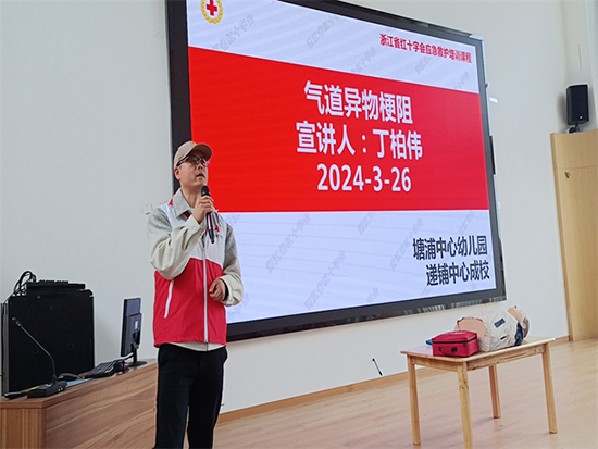 3月26日,安吉縣社區教育學院遞鋪分院組織開展急救知識進校園活動,邀請安吉紅十字會的丁柏偉老師授課,來自安吉縣塘浦幼兒園的80多位教師參加培訓。