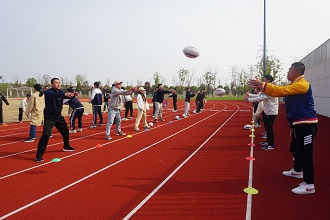 在午后互動環(huán)節(jié)中,老師們分成三組互相學習,分別體驗了英式橄欖球、飛盤和地擲球運動,感受了新興體育運動項目的魅力。